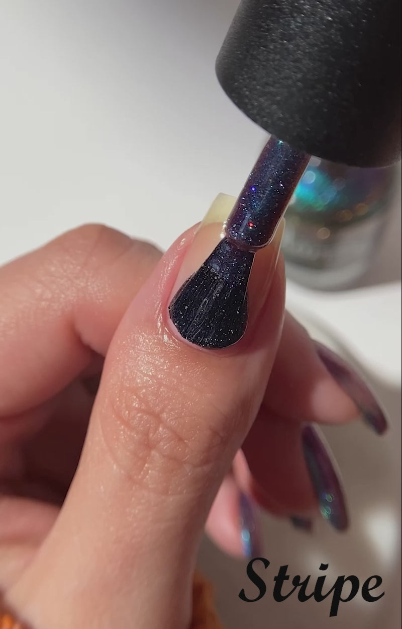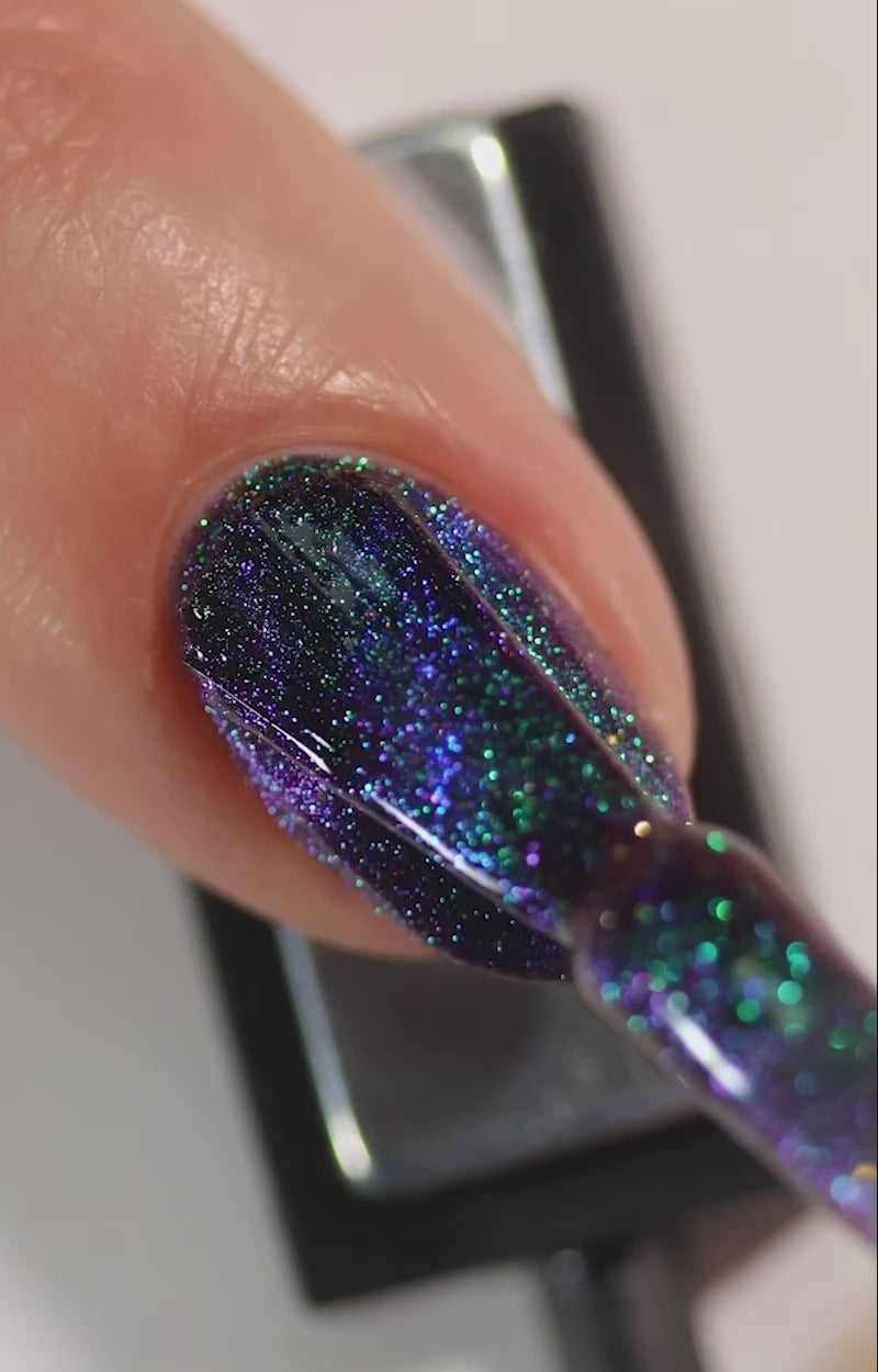Experience the electrifying power of a geomagnetic storm with Geomagnetic Storm Sights, a polish that shifts and transforms like the auroras dancing in the sky. Unmagnetized, it gleams as a deep teal multichrome shifting between hues of teal, blue, green and purple, mirroring the intense colors of an arising Geomagnetic Storm. But once magnetized, the polish, like a storm, intensifies, revealing a deep green, like solar energy igniting the atmosphere. A subtle blue-to-purple magnetic effect ripples through the base, creating a striking contrast that mimics the motion of charged particles colliding in the sky.