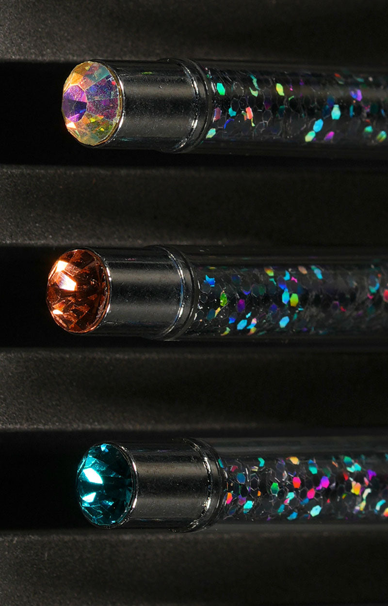 The handles encompass beautiful decorative black holographic glitter making each brush a striking work of art.