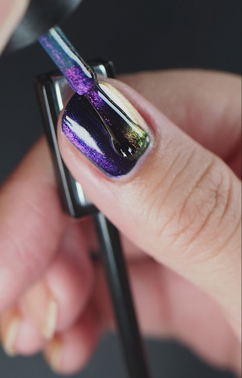 Method 2: Apply a layer of our one-coat black nail polish Vantablack® and let dry completely. Paint one layer of the magnetic nail polish over it and hold the magnet tool near the wet nail polish. Repeat with another coat if needed.
